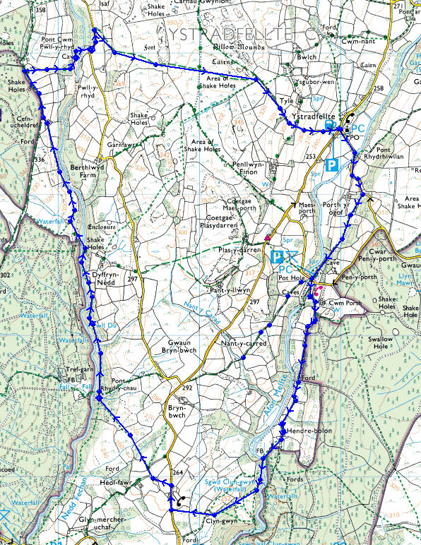 This walk is along interesting parts of the Nedd Fechan and Afon Mellte rivers, starting in the car park at Ystradfellte. It shows the route I took in October 2005. The route and geology is described in detail in Excursion 3 'The Mellte and Nedd Fechan Valleys' on page 14 of 'Caves and Karst of the Brecon Beacons National Park' A field guide by Mike Simms, BRCA Cave Studies Series, Number 7, 1998, ISBN 0 900265 20 5.