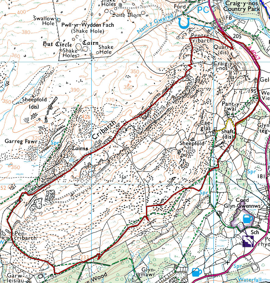 This walk goes up to the summit and around the imposing Cribarth limestone crag above Craig-y-Nos Castle on the southern edge of the Brecon Beacons National Park. It has fine views to the North and later to the South.