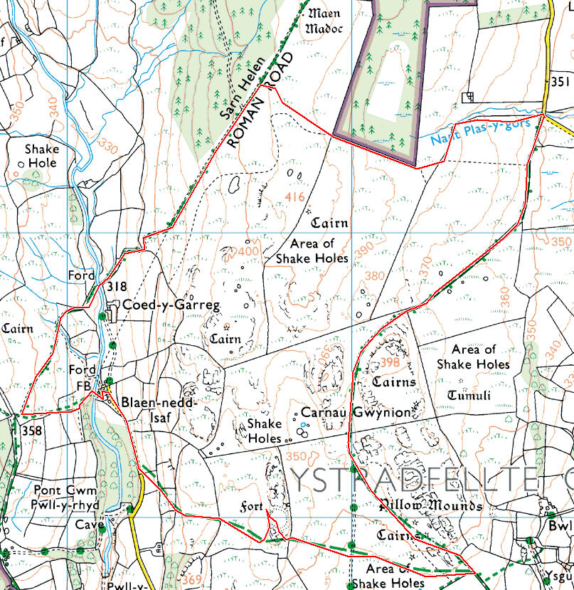 This walk is on limestone mountain pasture between the Nedd Fechan and Afon Mellte rivers. It shows the route I took in April 2004.